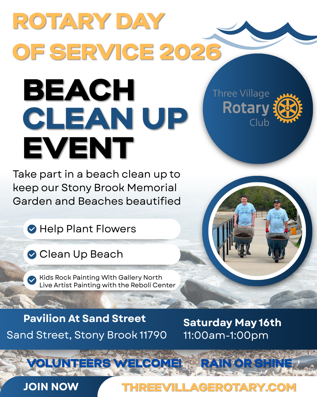 On Saturday, May 3rd, the Three Village Rotary hosted its annual Day of Service in Stony Brook. Volunteers came together to enhance the beauty of our community by planting and mulching the Rotary Memorial Garden and cleaning up Sand Street Beach. Families enjoyed activities like coloring and rock painting for the kids. A heartfelt thank you to Green Machine Landscaping for their support with stump removal, Carl Bongiorno and Sons, Inc. for providing mulch, and Town Of Brookhaven Councilmember Jonathan Kornreich for his invaluable assistance.
